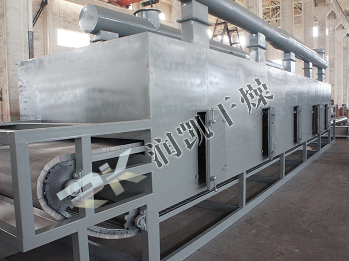 物料由加料器均勻地鋪在網(wǎng)帶上,網(wǎng)帶一般采用12-60目不銹鋼絲網(wǎng),由傳動裝置拖動在干燥機(jī)內(nèi)移動。干燥機(jī)由若干單元組成,每一單元熱風(fēng)獨(dú)立循環(huán),部分尾氣由專門排濕風(fēng)機(jī)排出,廢氣由調(diào)節(jié)閥控制,熱氣由下往上或由上往下穿過鋪滿物料的網(wǎng)帶完成熱量與質(zhì)量傳遞的進(jìn)程,帶走物料水份。網(wǎng)帶緩慢移動,運(yùn)行速度可根據(jù)物料溫度自由調(diào)節(jié),干燥后的成品連續(xù)落入收料器中。上下循環(huán)單元根據(jù)用戶需要可靈活配備,單元數(shù)量亦可根據(jù)需要選取。