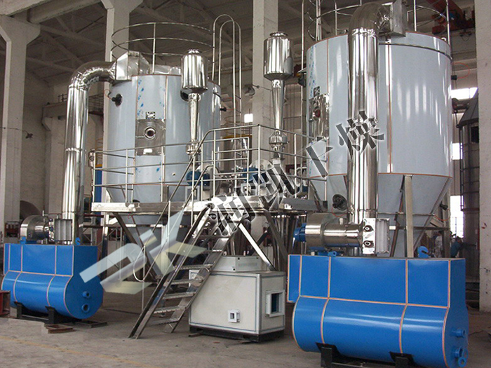 該生產線由供料系統(tǒng)、介質循環(huán)系統(tǒng)、空氣加熱凈化系統(tǒng)、干燥塔系統(tǒng)、收料系統(tǒng)、控制系統(tǒng)等多個系統(tǒng)整合而成。主塔系統(tǒng)集中了目前噴霧干燥工程的所有尖端技術,噴干機組的收料系統(tǒng)由一級旋風分離器+布袋除塵器組合形成。一級旋風采用高氣量高效率旋風進行收集,其收粉率能達到96%左右分,而布袋除塵器是針對蛋白粉類除塵專門設計的優(yōu)化設備,能使物料與風進行完全分離并沉降,布袋為拒水防油防靜電布袋,過濾目數(shù)可達500目以上。